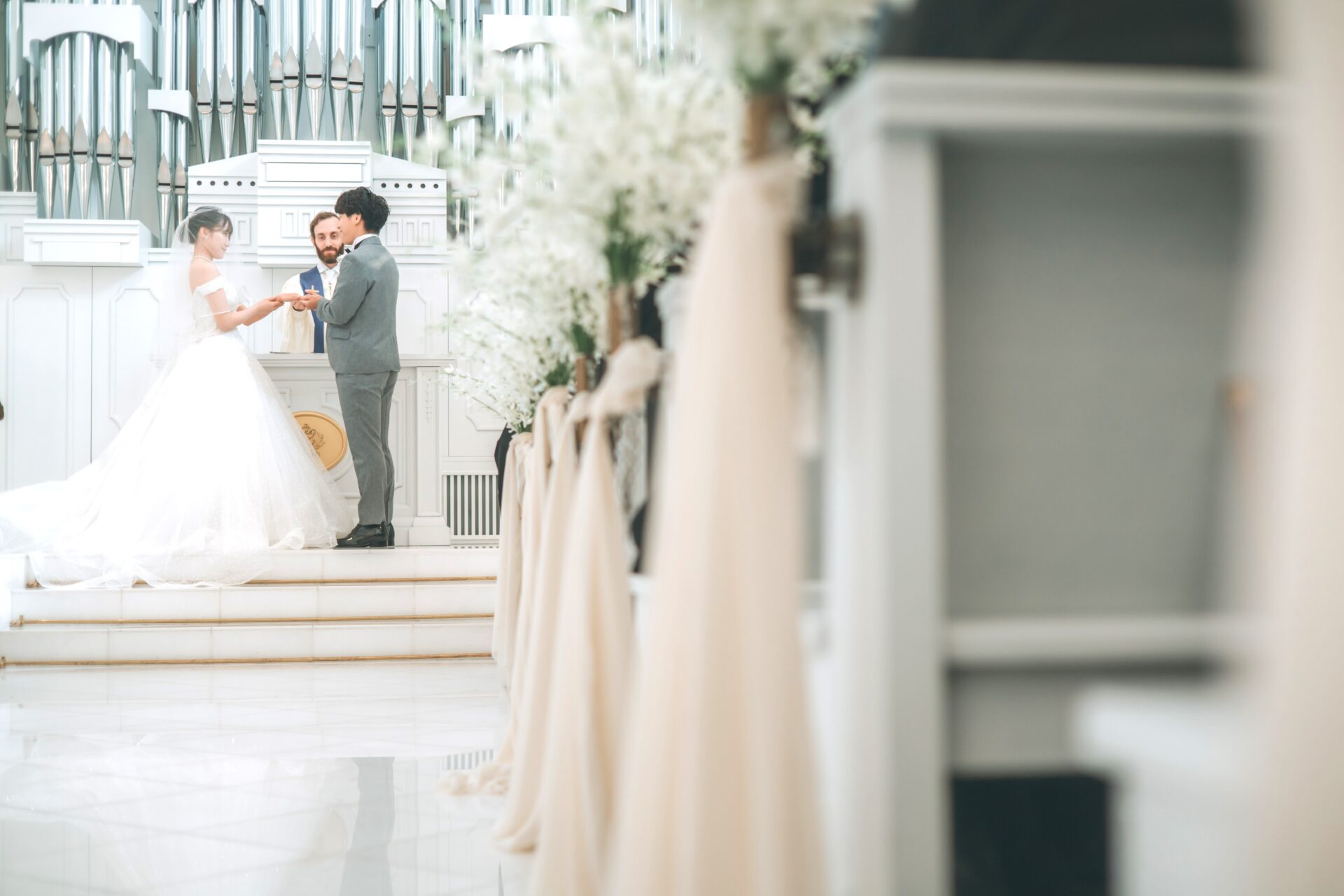 チャペルは天井が高く、真っ白で統一された中に青いステンドグラスがあり、自然光が差し込みキラキラしていて明るい素敵な会場でした。