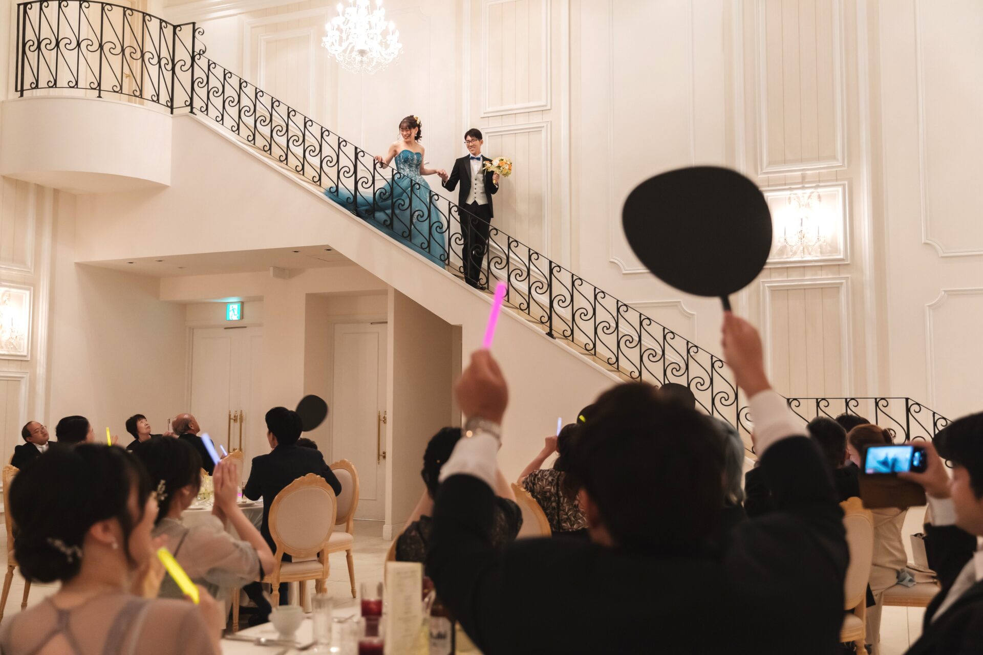 16枚のうちわを自作して1テーブルにつき1〜2枚配り、テーブルラウンドで使用しました。そのうちわに合わせて新郎新婦が各テーブルにファンサして回ることにしたので、ゲスト皆が自然に笑顔になりました。