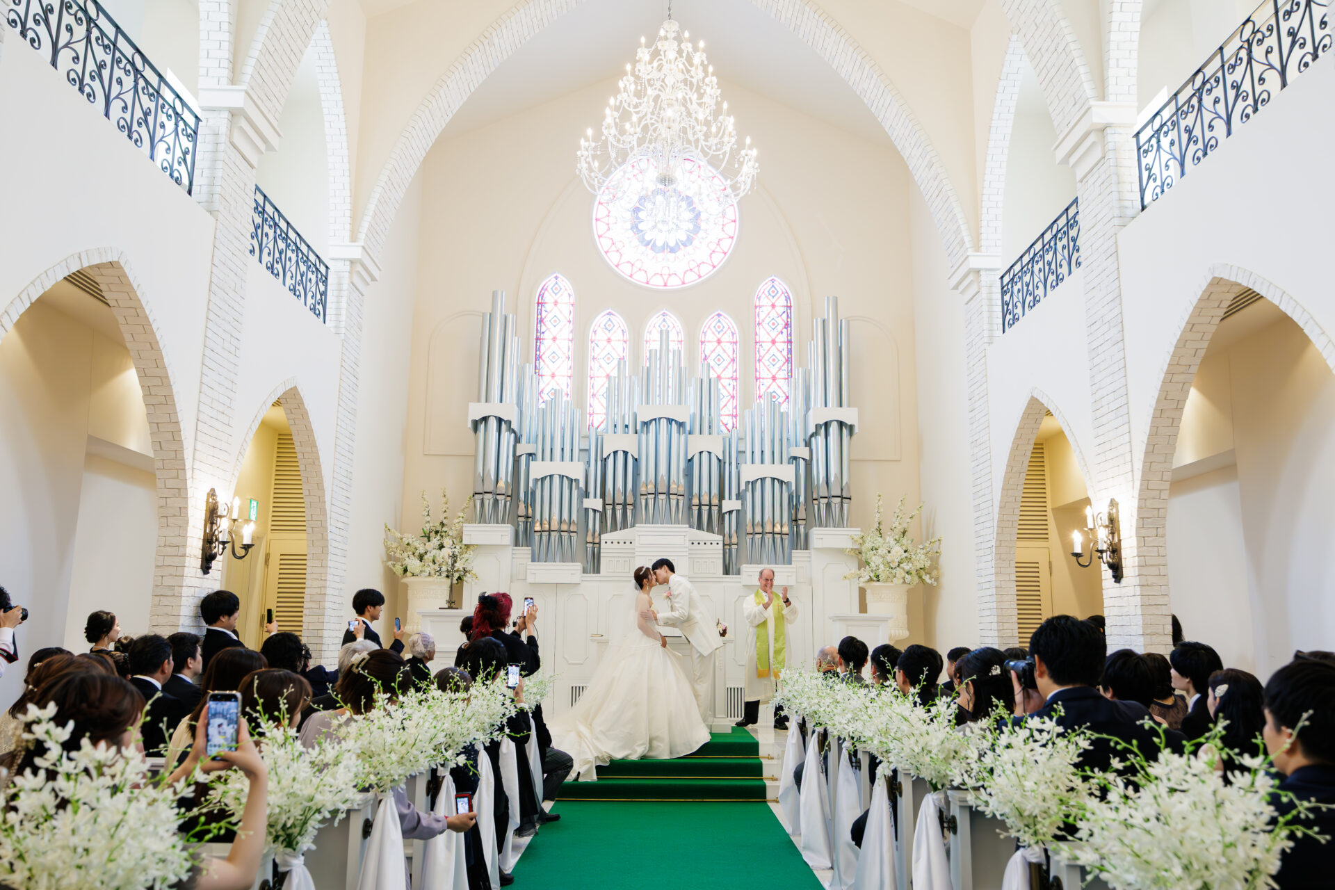 チャペルのヴァージンロードはこだわってグリーンをチョイス。