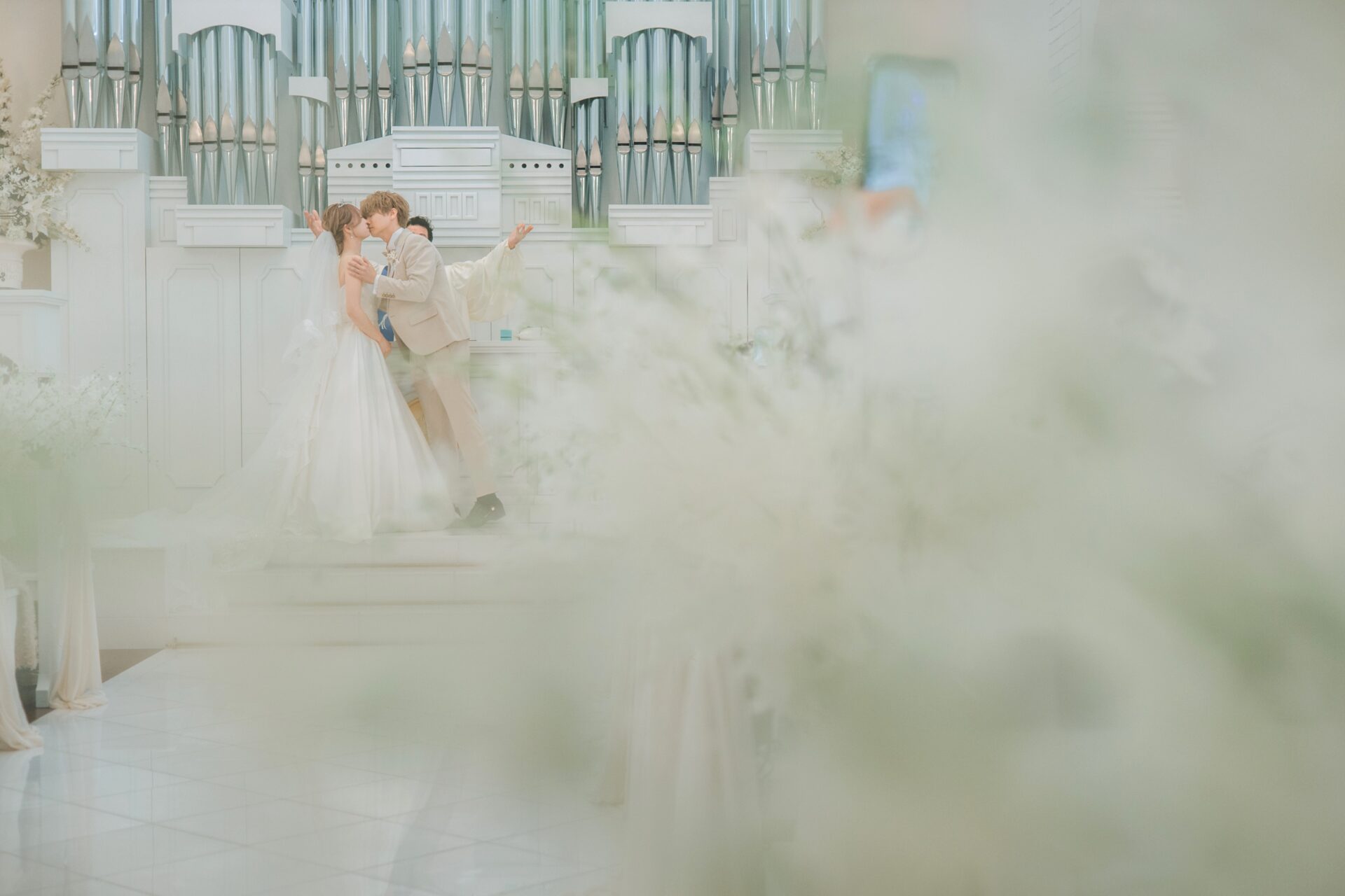 真っ白なバージンロードに綺麗なステンドグラスの光が差し込む大聖堂に一目惚れしたので、挙式ではその世界観が最大限映えるようにしたいとこだわりました。